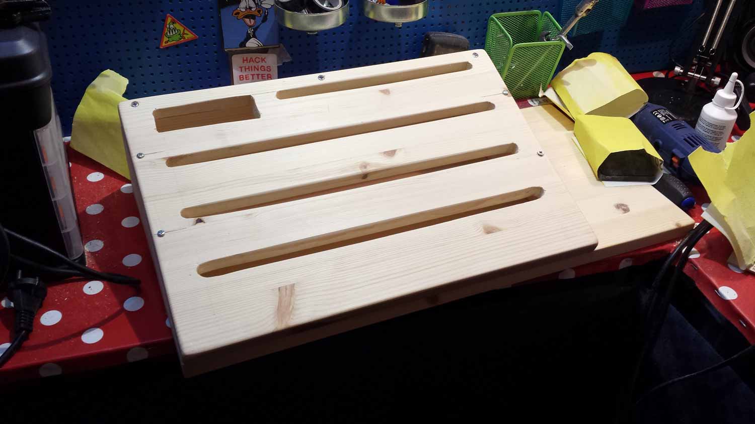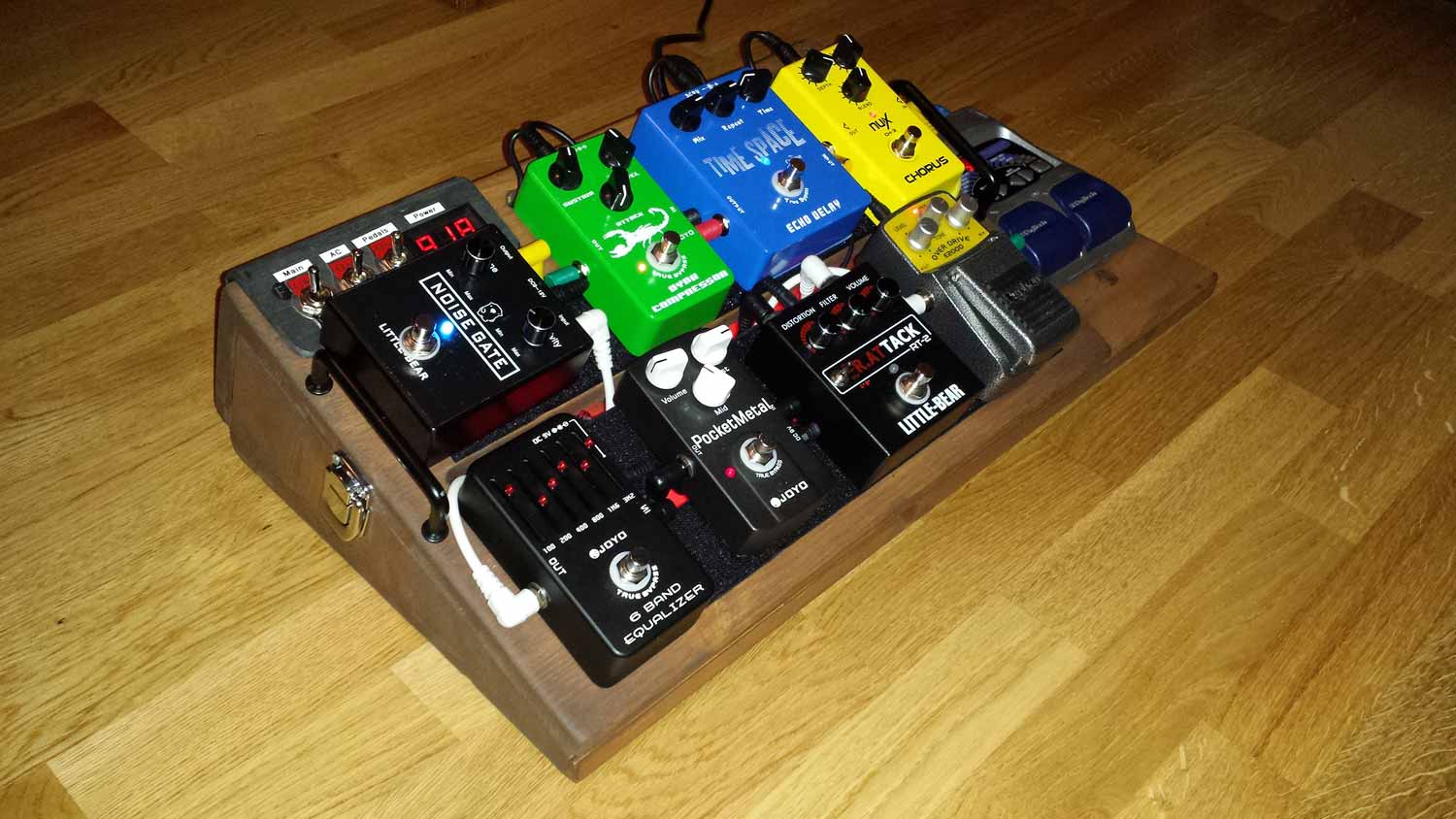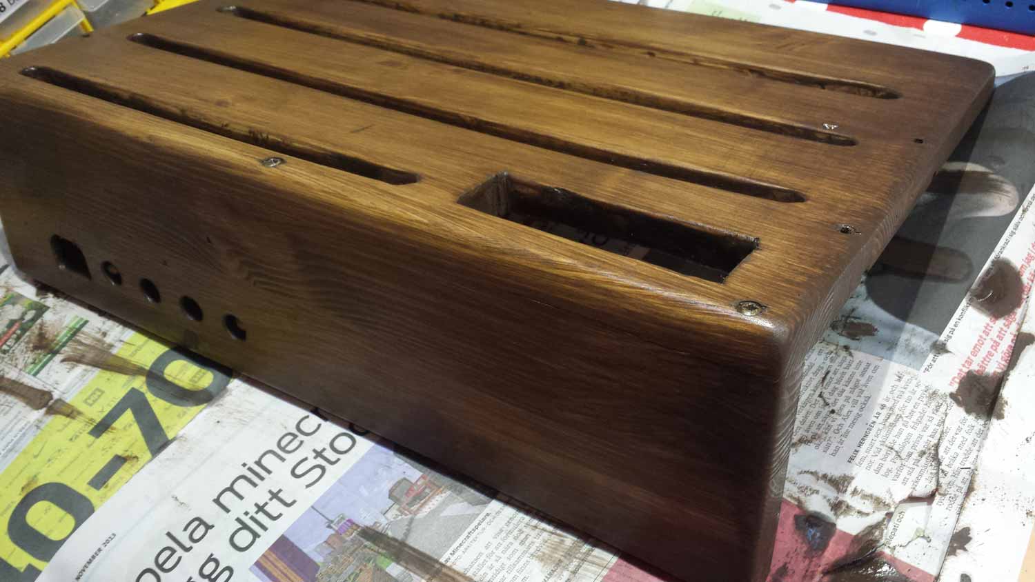 About two months ago I bought an electric guitar after a 17-18 year long hiatus. A cheap Les Paul copy that looks good but plays bad. 😉 I also bought a few effect pedals such as Overdrive, Distortion and Echo/Delay. And then a few more. I realized that I needed a pedalboard to avoid having to patch in everything and getting wires all across the floor whenever I wanted to play. I was looking at a number of the pre-made solutions and also a few custom ones before deciding to build one myself. Wanting to add some additional functions and a semi-retro style, I decided to go with wood as my material of choice. After measuring, sketching, drawing and calculating about two weeks I had a finished design. I bought two pine planks and began by drawing up lines for everything that were to be cut and drilled. I wanted an empty place on the right side where I could add additional pedals such as Wah, or as in the pictures below, a multi-effect pedal. After producing the rough pieces, I began sanding everything by hand. Since this is not going to be displayed on a pedestal in an art museum, I only went with 120 grain paper. The top parts were first glued, then drilled and screwed for additional stability. After a single layer of wood stain, I assembled the pieces using a piano hinge for opening the lid and a pair of chest clasps for fastening the lid when closed. Wanting something to carry the pedalboard with, I opted for IKEA ULVSBO drawer handles. While at IKEA, I also picked up the laptop support BRÄDA, which after cutting out a piece from a lower corner and flipping upside down was a perfect fit for the dashboard. Filing the corners and sanding it in a single direction made it look a bit like ebony. Adding all jacks, switches and panels, next up was the soldering. No biggie. Aside from power, I wanted 4 jacks on the pedalboard: