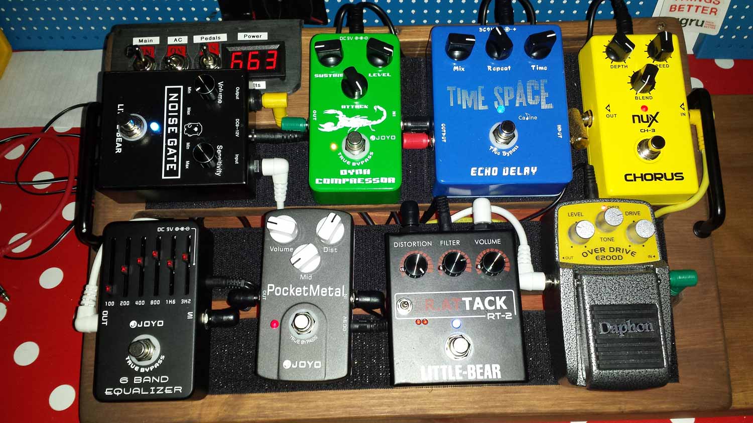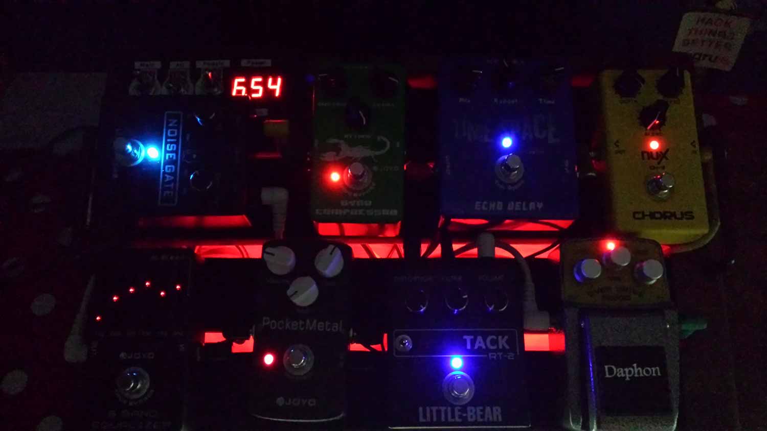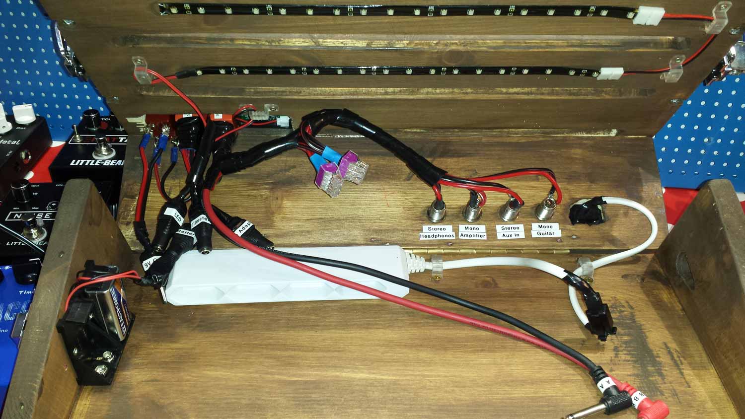 All power cables are detachable and reroutable. This gives you the option to power only one or a few pedals with battery power and the remaining pedals with the transformer. This includes the main power switch, voltmeter and LED strips. If running everything on batteries, it eats batteries fast – especially the Korg RP50 multi-effect – but it works! After adding some industrial-strength Velcro, it was only a matter of arranging the pedals how I wanted them, patching the audio signal and routing the power cables. I also added TDK ferrite cores around all patch/power cables to minimize electrical interference. Being only the second wood-based project I’ve done since I was 15, I’m quite happy with the results. What would you have done different? I am already thinking about version 2. 🙂