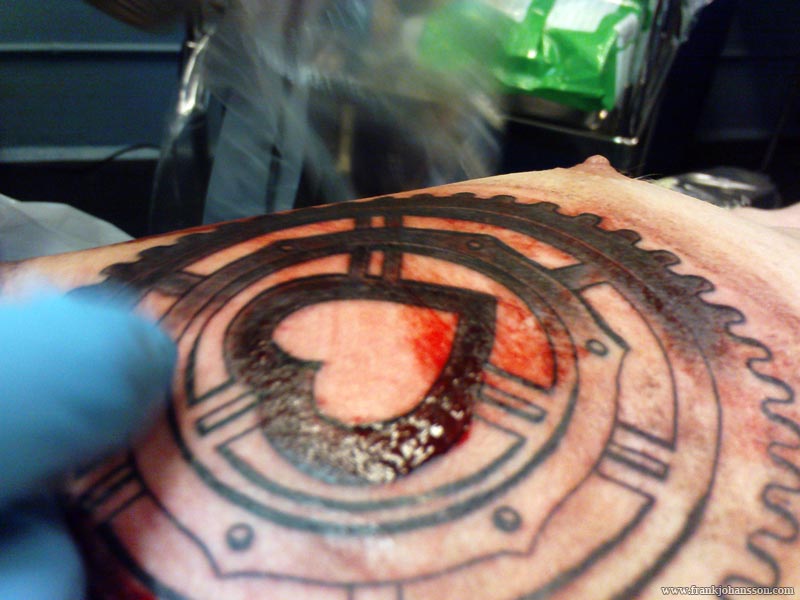 Tattooing your chest is a strange thing. It really hurts, but you don’t always feel the pain where you should. When Nille first started on the top right side, I felt it in the shoulder. Moving down, all of the sudden it felt like someone put a soldering iron to my nipple. This was not quite as bad as doing the elbow, but not far from it. Good thing I had my phone with me; Playing Solitaire and FreeCell partly took my mind from the pain – It helps to concentrate on something else.