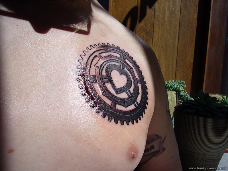 I have always been fascinated by mechanics, robotics and mechatronics, and for the last few years I have been thinking about how to incorporate that into a tattoo. Early sketches covered basically the whole back, incorporating the biohazard sign I already have on my back into the design. Though I like biomechanical tattoos to a certain degree I now think an entire backpiece would be too much for this type of design (ask me again in five years though). The particular idea with a cogwheel using a heart as the hub first crossed my mind about a year ago, and shortly after I did the first design.
